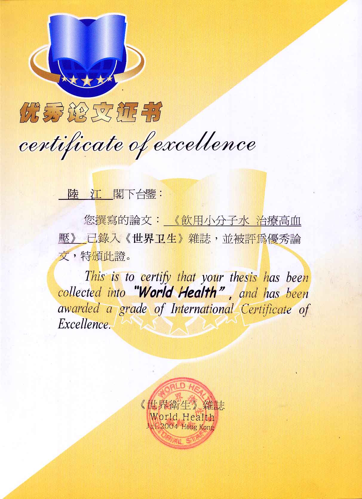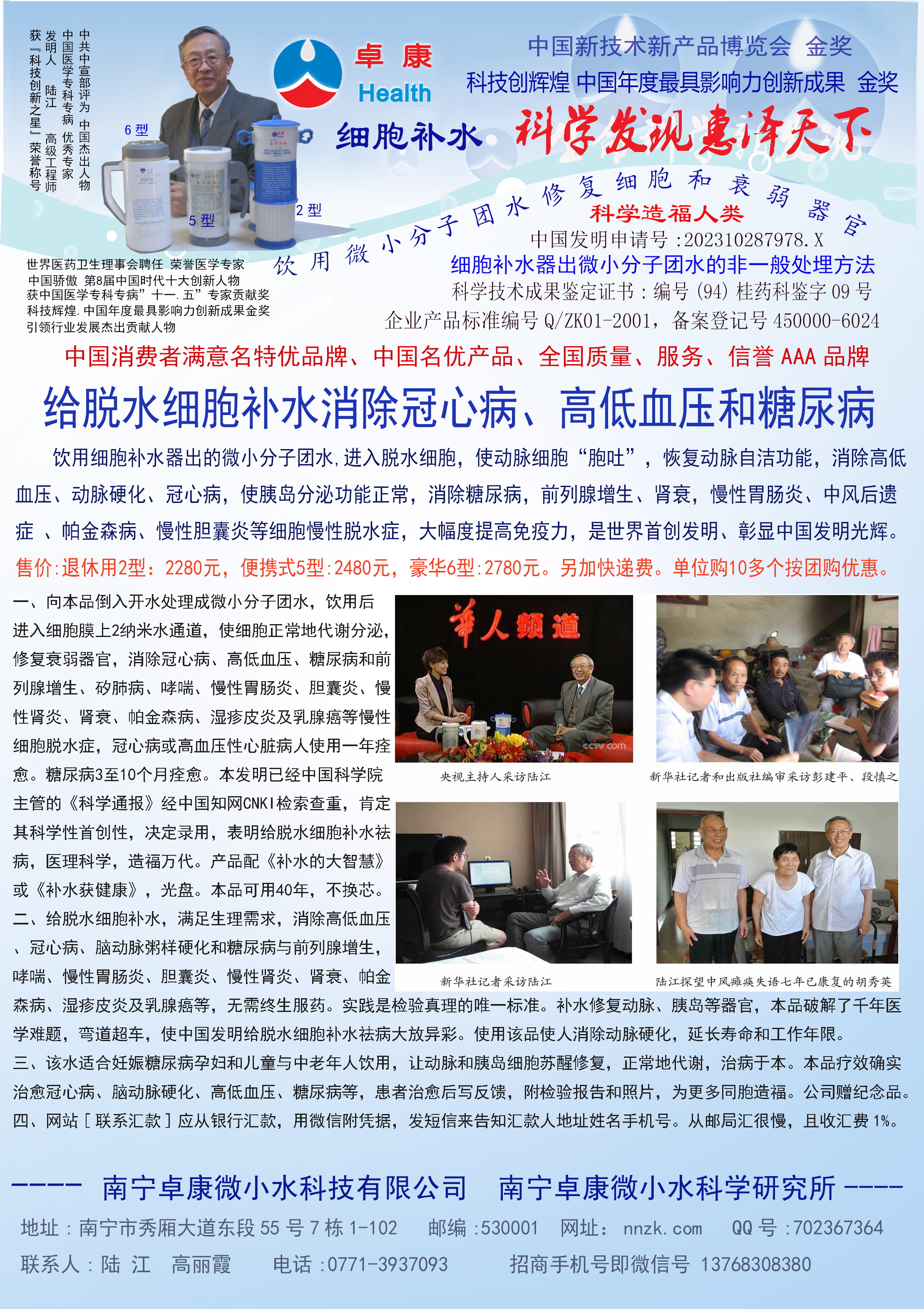 -----我是從事建筑的高工,本來沒有資格去攻克醫(yī)學(xué)難題,卻為了自身健康才扣響醫(yī)學(xué)的大門。由于我1990年患高血壓,因怕中風(fēng)才研究發(fā)明了離子水瓶,我把水處理成微小分子團(tuán)水,飲用后治愈了高血壓。便于1993年底送到三家省級(jí)醫(yī)院做臨床試用4個(gè)月。經(jīng)北京和廣西醫(yī)學(xué)專家鑒定:"降脂降壓效果好"," 能擴(kuò)大心腦動(dòng)脈流量,改善心腦電圖以及微循環(huán)","對(duì)治療心腦動(dòng)脈粥樣硬化、高血壓、高血脂有良好的醫(yī)療保健作用。""產(chǎn)品的技術(shù)性能和療效達(dá)到了同類產(chǎn)品的國內(nèi)領(lǐng)先水平,經(jīng)廣西醫(yī)學(xué)科學(xué)情報(bào)研究所檢索,未見國外有類似報(bào)道。"中國醫(yī)學(xué)科學(xué)院張正國教授從美國國立醫(yī)學(xué)圖書館數(shù)據(jù)庫存Medline檢索英俄文資料,均未見類似報(bào)告。2000年上市后,我為了對(duì)消費(fèi)者負(fù)責(zé)而繼續(xù)觀察研究,一直通過《信譽(yù)卡》和《質(zhì)量跟蹤調(diào)查書》向患者承諾療效,請(qǐng)用戶使用6個(gè)月后反饋效果。和脂壓患者飲用2至5個(gè)月內(nèi),消除癥狀,停服藥物,血壓正常;冠心病患者飲用3~5個(gè)月逐漸減輕至消除心絞痛、房顫等癥狀,不再服藥,飲用1年左右心電圖正常,經(jīng)冠脈造影掃描無明顯狹窄,表明冠心病痊愈。大量患者還反映許多衰弱器官被修復(fù),讓前列腺增生、慢性咽喉炎、慢性氣管炎、支氣管炎、慢性胃炎、腸炎和膽囊炎等不藥而愈;2型糖尿病患者是因?yàn)橐葝u衰弱致病,飲用該水半年至一年,逐漸減藥至停藥,血糖尿糖正常,真正治愈2型糖尿病。中風(fēng)后遺癥患者飲用六七個(gè)月,可逐漸減輕至消除肢體和語言障礙,表明飲用該水能讓壽命很長的神經(jīng)元細(xì)胞逐漸修復(fù),奇跡般地恢復(fù)肢體和語言功能。飲用后還使胸腺和脾臟兩個(gè)重要的免疫器官被修復(fù)和增強(qiáng),產(chǎn)生免疫細(xì)胞多,提高了免疫力,使人不生病或少生病。自此, 飲用微小分子團(tuán)水創(chuàng)造了攻克冠心病、高(低)血壓和糖尿病三大醫(yī)學(xué)難題的奇跡。人們對(duì)此感到不可思議,但實(shí)踐是檢驗(yàn)真理的唯一標(biāo)準(zhǔn)。