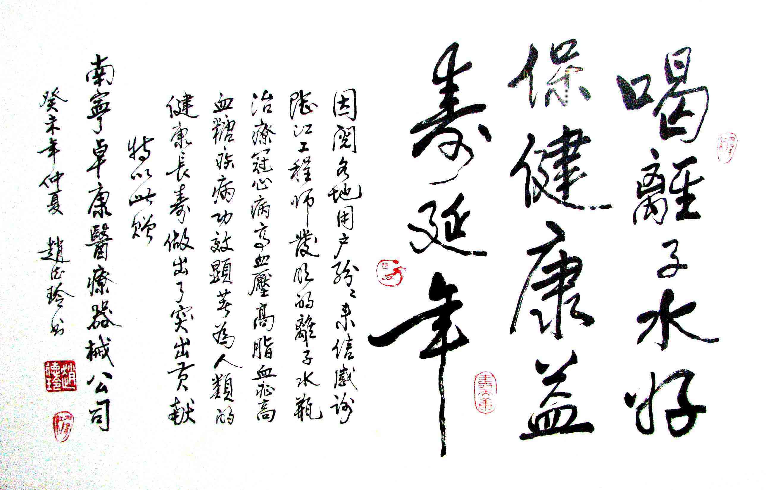 - -- 幾千年來,人類靠醫(yī)藥不能根治冠心病、高血壓和糖尿病,如想根治,那是夢(mèng)想??墒?,我從中國基礎(chǔ)醫(yī)學(xué)研究成果受到啟發(fā),研發(fā)了一種發(fā)明產(chǎn)品,處理出微小分子團(tuán)水讓人飲用,實(shí)現(xiàn)了人類這一夢(mèng)想!患者飲用后遠(yuǎn)離了冠心病、高血壓和2型糖尿病。這一成果曾經(jīng)過臨床試用和專家鑒定,作為準(zhǔn)字號(hào)醫(yī)療器械讓廣大患者飲用,療效進(jìn)行跟蹤調(diào)查。很多患者的反饋情況令人感動(dòng),我放在公司網(wǎng)站上(nnzk.com),震撼了醫(yī)學(xué)專家,也使廣大同胞受到啟發(fā)。人們盼望飲用它給細(xì)胞補(bǔ)水,治愈多種病癥,既省錢,又安全,而且延長壽命。