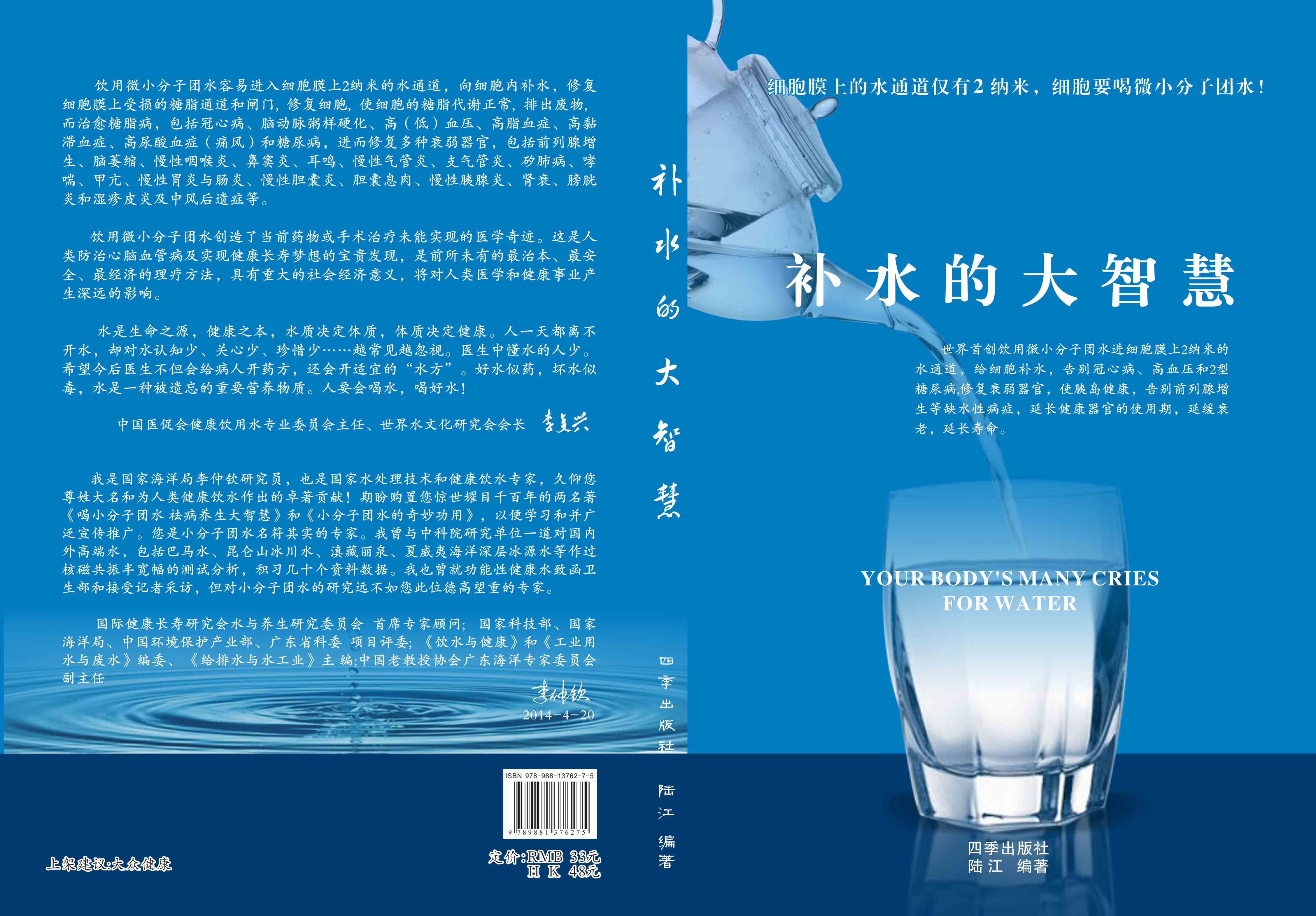 ----幾千年來,人們感到口渴才喝水,誤認(rèn)為口渴是唯一的缺水信號(hào),使喝水量偏少。很多人只知道補(bǔ)血補(bǔ)氣補(bǔ)腎補(bǔ)鈣補(bǔ)硒,而不知補(bǔ)水,逐漸使許多器官缺水,包括皮膚、動(dòng)脈、氣管、膽囊、腸胃、骨關(guān)節(jié)、腎臟、前列腺和胰島缺水,以致患冠心病、高(低)血壓和糖尿病等缺水性病癥。美國F·巴特曼醫(yī)學(xué)博士寫有《水是最好的藥》一書很受歡迎,我國2007年譯成中文版,論述人體缺水引起許多病癥,他指導(dǎo)3000多患者喝水治愈了哮喘、胃炎和高血壓等病癥。而我是從2000年起,讓患者飲用微小分子團(tuán)水,因?yàn)槿菀走M(jìn)細(xì)胞膜上2納米的水通道,治愈了許多缺水性的病。我跟蹤調(diào)查14年,發(fā)現(xiàn)凡是認(rèn)真飲用和合理膳食,可治愈冠心病、高(低)血壓和2型糖尿病與衰弱器官并發(fā)癥及中風(fēng)后遺癥。高血壓患者飲用2~5個(gè)月,癥狀消除,不再服藥,逐漸逆轉(zhuǎn)至消除動(dòng)脈粥樣硬化,血壓正常穩(wěn)定,治愈了高血壓;冠心病人飲用3~5個(gè)月,消除心絞痛、房顫等癥狀,不再服藥,一年左右心電圖正常,經(jīng)冠狀動(dòng)脈造影掃描表明冠脈內(nèi)無粥樣斑塊,真正治愈了冠心?。?型糖尿病人飲用3~10個(gè)月停藥,血糖尿糖正常,糖尿病痊愈。并且使前列腺增生、慢性咽喉炎、鼻竇炎、耳鳴、慢性氣管炎、支氣管炎、哮喘、矽肺病、慢性胃腸炎、膽囊炎、胰腺炎、腎衰、膀胱炎、風(fēng)濕性關(guān)節(jié)炎、便秘、痔瘡和濕疹皮炎等不藥而愈,而無需終生服藥。飲用微小分子團(tuán)水治愈的是長期吃藥治不好的病,彌補(bǔ)了幾千年來醫(yī)藥的欠缺,成為人類健康的寶貴資源。