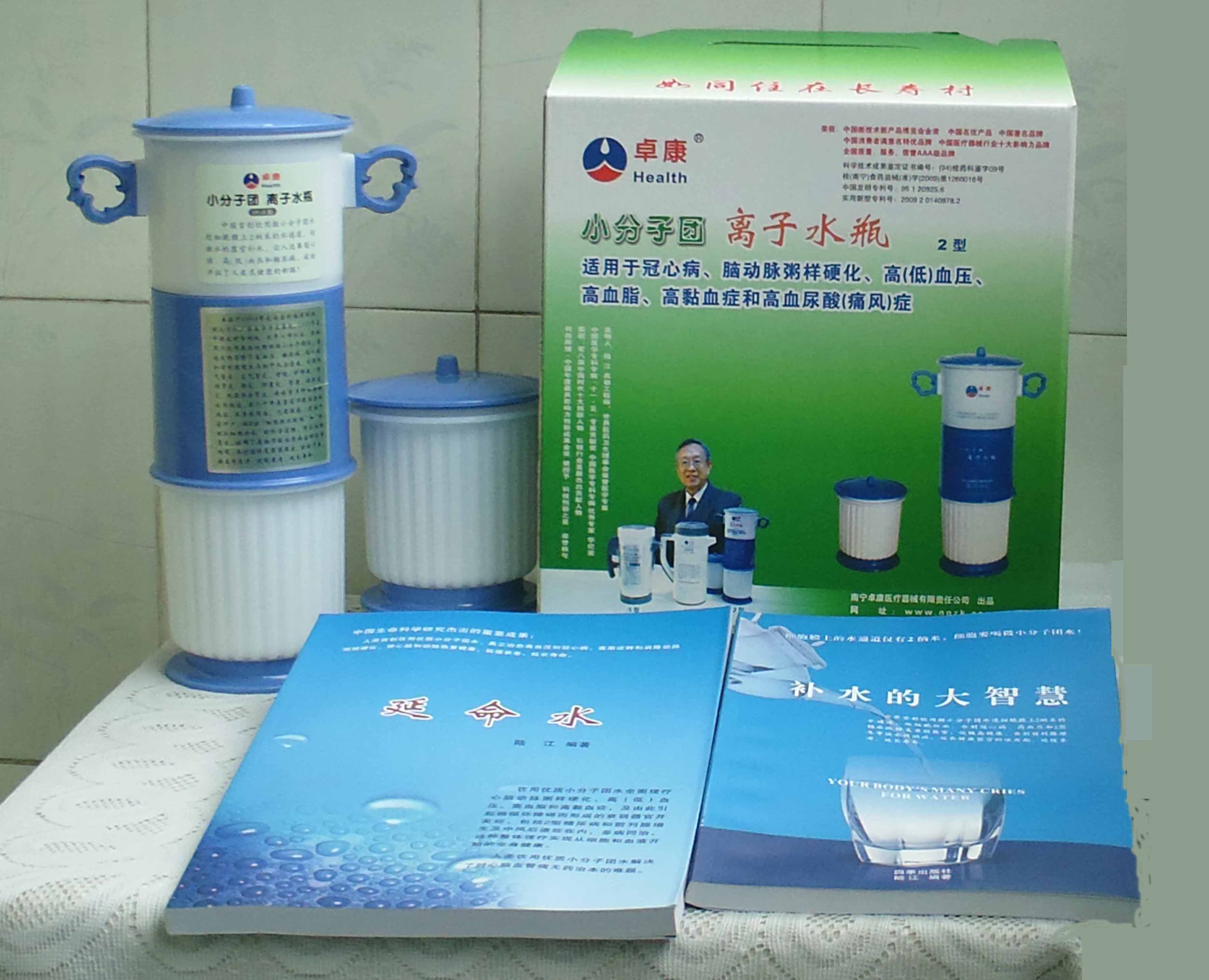 本品大量用戶的使用效果表明,能治愈冠心病、腦動(dòng)脈硬化、原發(fā)性高(低)血壓、高血脂、高粘血癥、高血尿酸癥(痛風(fēng))和2型糖尿病、衰弱器官并發(fā)癥(前列腺增生、腎衰與尿毒癥)及中風(fēng)后遺癥等療效好。產(chǎn)品配信譽(yù)卡。使用壽命30年,不換芯,易清洗。團(tuán)購優(yōu)惠。從郵局匯款,匯費(fèi)1%,地址按本頁下方地址、聯(lián)系人寫。從銀行匯款,請(qǐng)點(diǎn)擊[聯(lián)系匯款]欄,從工商銀行匯款,建設(shè)銀行、農(nóng)業(yè)銀行匯款,均免收匯費(fèi),匯款后20--30分鐘內(nèi)發(fā)短信,可用微信轉(zhuǎn)帳,均免匯費(fèi),微信號(hào)即手機(jī)號(hào)13768308380。匯款后,告知你的姓名和地址,我公司聯(lián)系人手機(jī)號(hào)是:13768308380。卓康牌離子水瓶為我公司獨(dú)家生產(chǎn),郵購產(chǎn)品配《補(bǔ)水的大智慧》彩印書一本,另配四季出版社出版的新書《補(bǔ)水的大智慧》一本,并配光盤一張(含央視主持人釆訪陸江的對(duì)話視頻)。目前市場(chǎng)和"淘寶網(wǎng)"上有人兜售假冒的偽品,望讀者審察辯別真?zhèn)?,造假者剽竊假冒本公司的各種認(rèn)證、獲獎(jiǎng)獎(jiǎng)項(xiàng)、專利號(hào)和外包裝盒上的中英文字,包括科技成果的鑒定意見等,請(qǐng)讀者注意防偽。如何識(shí)別假貨?已經(jīng)買了假貨怎么辦?(請(qǐng)點(diǎn)擊[打假掠影][打假掠影])。
