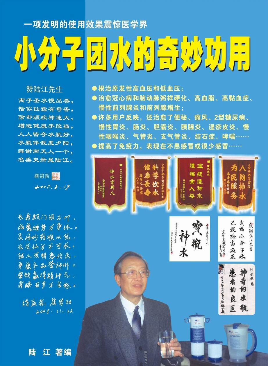 人類幾千年來患以上病癥需終生服藥,幾十年也不能治愈??墒俏覈蠈幍母呒?jí)工程師陸 江,于1990年想根治高血壓,研究發(fā)明了離子水瓶,處理出微小分子團(tuán)水供飲用,經(jīng)過醫(yī)院臨床試用和專家鑒定,1999年獲中國發(fā)明專利權(quán),產(chǎn)品于2000年投放市場(chǎng)后一直跟蹤調(diào)查,據(jù)全國各地用戶反饋:祛除了高低血壓、糖尿病和冠心病,并使前列腺增生、咽喉炎、鼻竇炎、慢性氣管炎、支氣管炎、矽肺病、哮喘、慢性胃炎、腸炎、慢性膽囊炎、慢性腎炎、腎衰、膀胱炎、便秘、痔瘡、風(fēng)濕性關(guān)節(jié)炎和濕疹皮炎及中風(fēng)后遺癥等病癥不藥而愈。為什么喝微小水能治20多種病?陸 江從1991年德國科學(xué)家發(fā)現(xiàn)細(xì)胞膜水通道僅為2納米獲得啟發(fā),認(rèn)為多種器官患病是因細(xì)胞脫水,不能正常代謝和分裂增殖,才使器官細(xì)胞減少致衰弱萎縮而形成細(xì)胞缺水性病癥。22年來的實(shí)踐有力地支持了“細(xì)胞脫水致病”這一重要論點(diǎn),表明喝微小水可滿足細(xì)胞的生理需求,補(bǔ)水就能祛病,是生命科學(xué)新亮點(diǎn)。