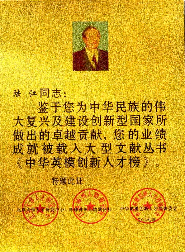 陸江的論文獲一等獎(jiǎng)榮譽(yù)證書-- 陸江論文獲創(chuàng)新論文獎(jiǎng)牌